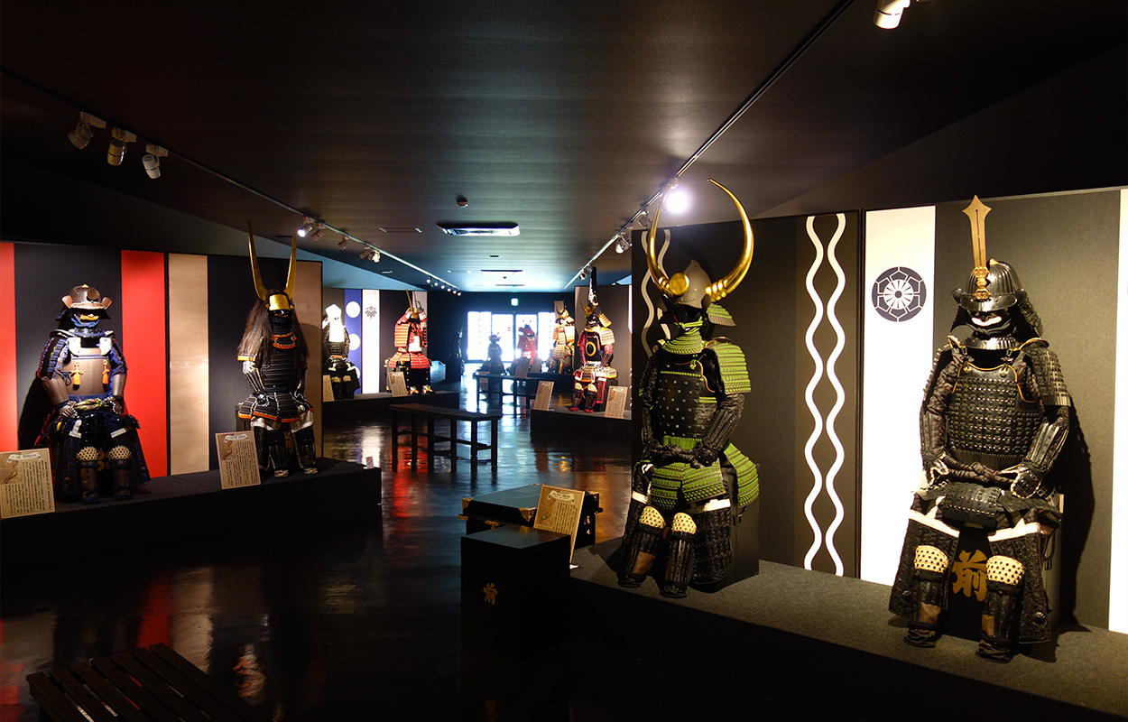 Precise reproduction suits of armor modeled after samurai warlords or generals from Japanese history.